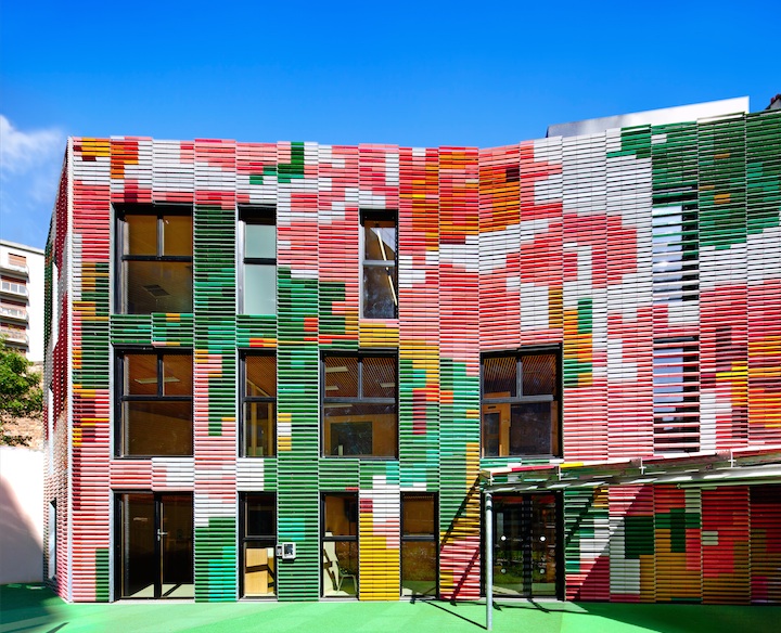 Le Blog Du Bâtiment : Pour parer une crèche implantée dans une cour intérieure à l’angle de la rue Frémicourt et du boulevard Grenelle à Paris, les architectes de l’agence Périphériques Architectes ont proposé un projet original autour d’une variation de brise-soleil. Conçus en terre cuite et émaillés avec des teintes vives et profondes réalisées sur-mesure, les brise-soleil de la gamme Autan® de TERREAL ont sublimé cette oeuvre architecturale en parfaite harmonie avec l’univers ludique et coloré de la petite enfance.